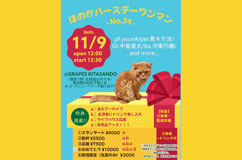 - ほのか / pf.younA / per.青木千洸 / gt.中島寛太 / ba.河東巧磨 / and more...